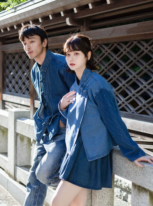 KF Slanted Lapel Washed Denim Shirt 盤扣斜襟拼袖短罩衫
